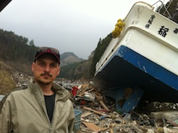 The drive took about 4 hours, and on the way we had to pass through the 30-kilometer “stay-indoor” zone set up by the Japanese government. At this point noone is allowed entry into the 20-kilometer “no-go” zone around the damaged Fukushima nuclear power station, but between 20-km and 30-km evacuation is still optional, although the government does advise staying indoors. We passed through this zone and headed farther North, to the coast. Along the way we began to see cars and rubble that had been left in rice fields by the tsunami when it retreated. That was nothing to compare to what we saw when we finally got to the coastal area around Ishinomaki.
